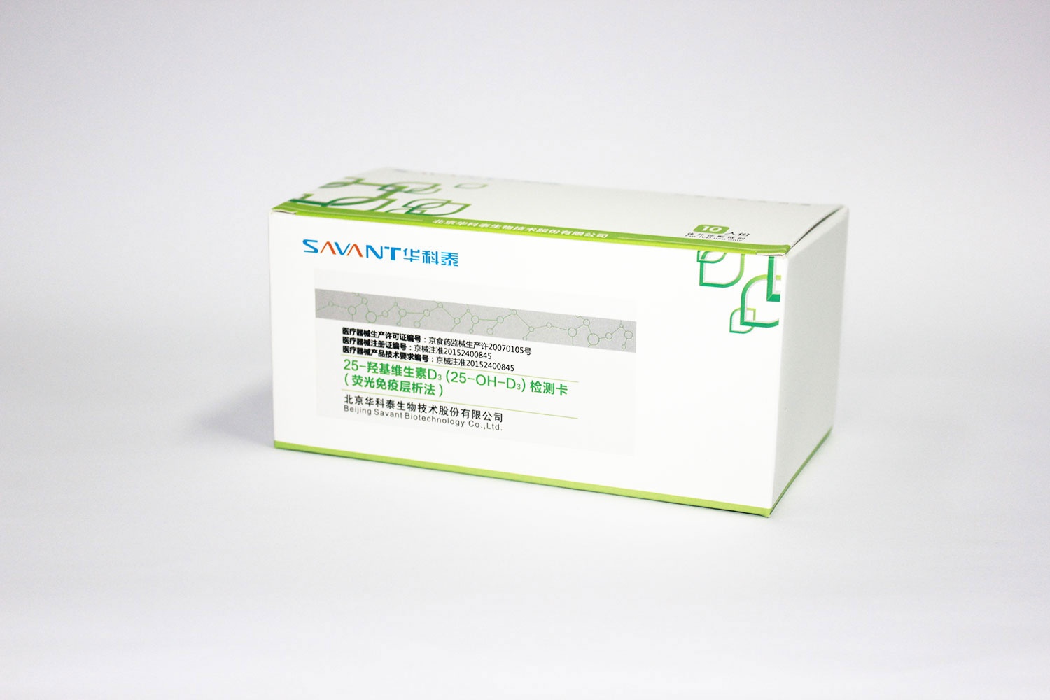 This test card is used for quantitative determination of 25 hydroxyvitamin D3 in human serum, plasma or whole blood in vitro. The two most important forms of vitamin D are vitamin D3 (cholecalciferol) and vitamin D2 (ergot calciferol). In human body, vitamin D3 and D2 combine with vitamin D binding protein in plasma and transport to liver. They become 25 hydroxyvitamin d after 25 hydroxylation. More than 95% of 25 hydroxyvitamin D detected in serum is 25 hydroxyvitamin D3. Vitamin D deficiency is a common cause of secondary hyperparathyroidism. Increasing the content of parathyroid hormone, especially in the elderly without vitamin D, will lead to osteomalacia, increase bone turnover, reduce bone quality, and have the risk of fracture. The low content of 25 hydroxyvitamin D3 is also related to the low bone mineral density. Combined with other clinical data, the results can be used as an auxiliary means to determine bone metabolism.